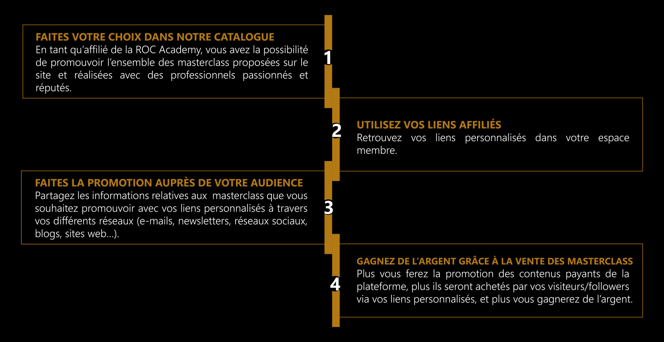 Les affiliés du programme d’Affiliation ROC gagnent 10% du prix de la Masterclass lorsqu’un achat est effectué à partir de leurs liens. Chaque affilié dispose de liens personnalisés pour chaque masterclass. Ce sont ces liens qu’il doit promouvoir pour recruter de nouveaux apprenants qui s’inscriront aux masterclass ROC. L’affilié peut suivre ses ventes en temps réel depuis son tableau de bord, en accédant à son compte sur la plateforme.
